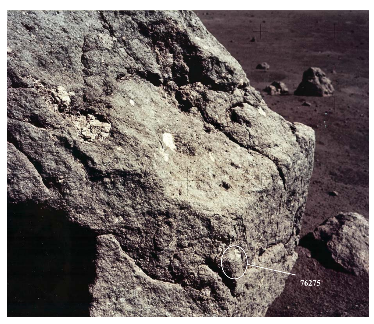 Figure 2: Original location of 76275 on side of block 1, of boulder at station 6, Apollo 17. AS17-140-21443.