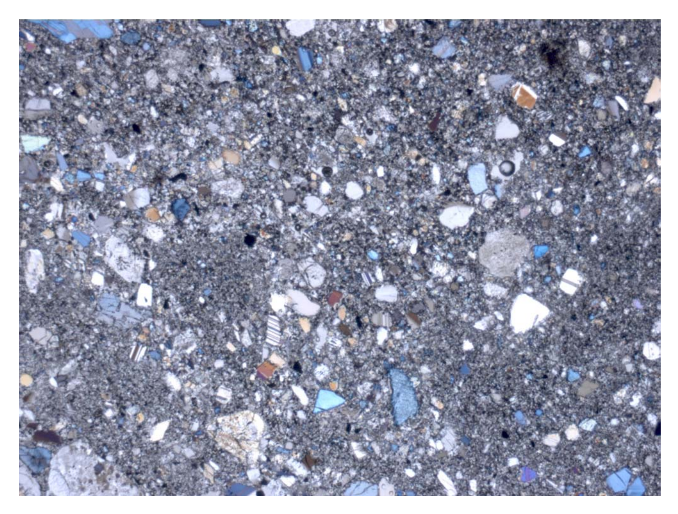 Figure 3: Photomicrograph of thin section 76275,4 by C Meyer. Partially crossed polarizers. Field of view about 2 mm.