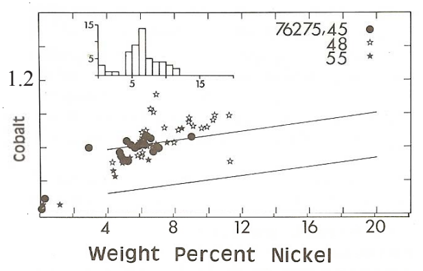 Figure 6: Ni and Co content of metal grains in 76275 (Misra et al. 1976).