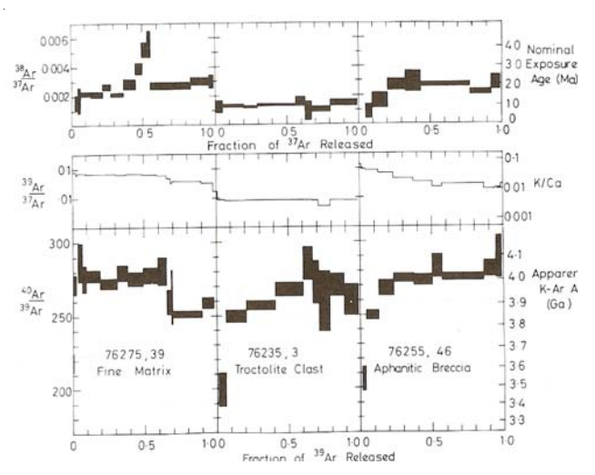 Section titled “Radiogenic age dating”Cadogen and Turner (1976) determined an age of 4.02 ± 0.04 b.y. by the Ar/Ar plateau technique (figure 7).