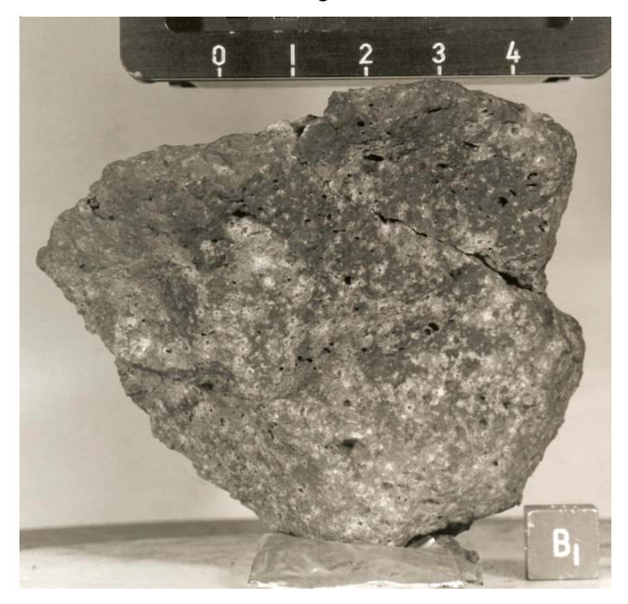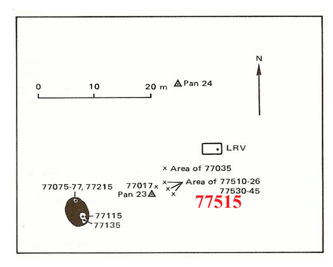 Section titled “Introduction”77515 was collected from the lunar surface a few meters from the station 7 boulder (figure 2). It is an impact melt breccia apparently similar to 77135. There is a patina with micrometeoite craters on all surfaces (figure 1). Numerous small vesicles are also apparent.