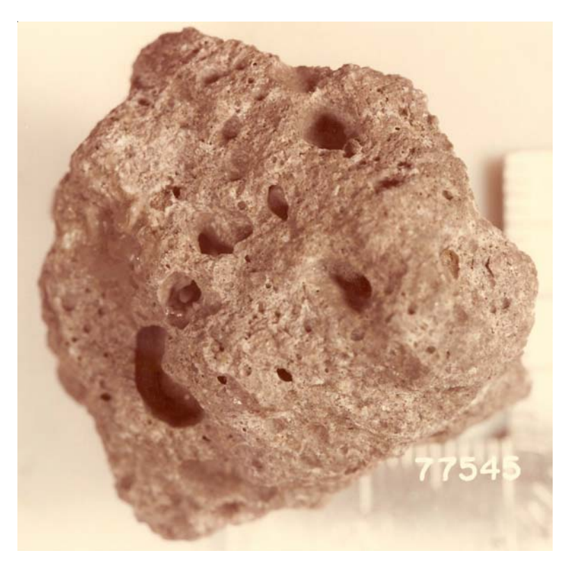 Figure 1: Photo of 77545 showing large vesicles. S73-31348. Sample is 3 cm. across.