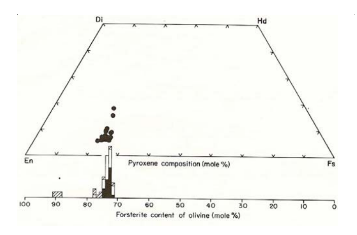 Figure 4: Pyroxene and olivine composition of matrix of 77545 (Warner et al. 1977).