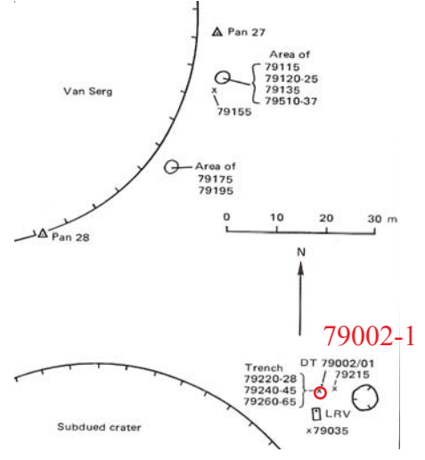Section titled “Introduction”A double drive tube was successfully collected at station 9, on the ejecta blanket of Van Serg Crater (figure 1). The location was about 70 m downslope from the rim (figure 2) and about 1 m from the trench sample (79220). 79002 is the upper section, 79001 the lower section of the core. The obvious stratigraphy seen in the trench is not duplicated in the core.