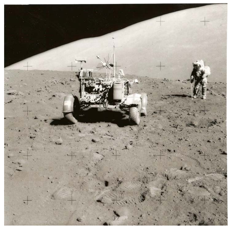Figure 1: Astronaut collecting double drive tube on rough terrain caused by ejecta from of Van Serg Crater. AS17-143-21836 (note map for fender!)