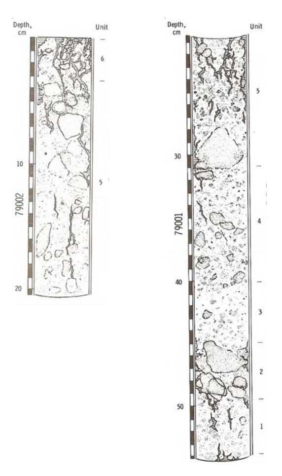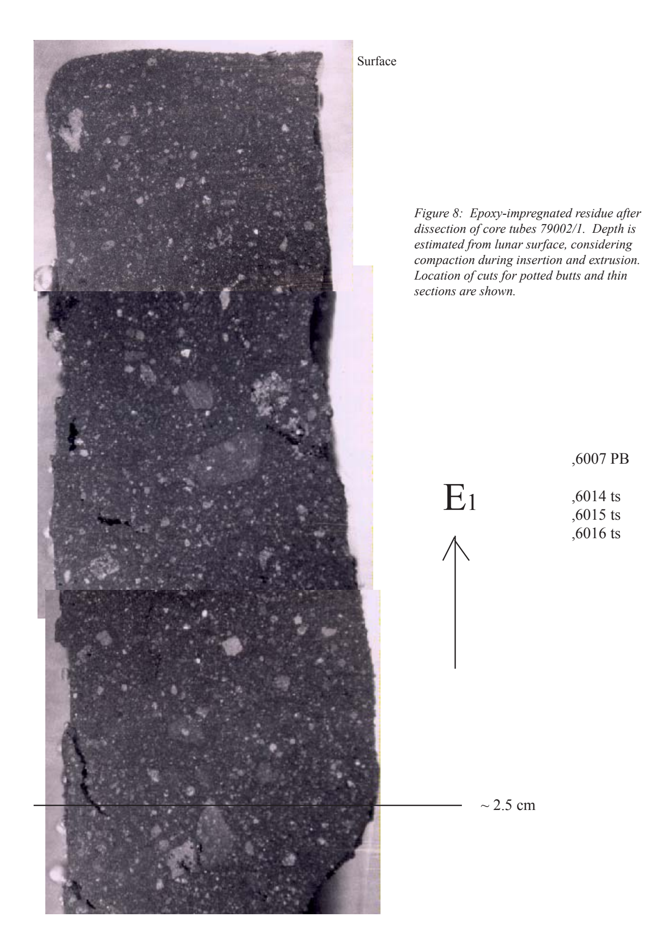 Section titled “Processing”According to Mitchell et al. (1973), it took less than 19 hammer blows to drive the core. A footnote in table 8 therein, mentions that 41 cm3 of material may have fallen out of the top of 79001 (a section in the middle)!