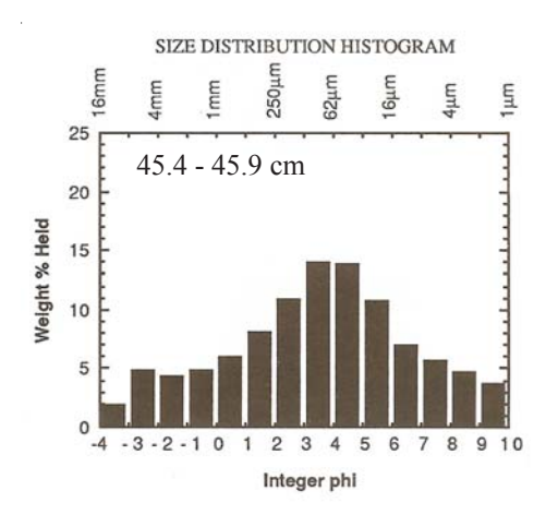 Figure 6a: Grain size distribution for 79002/1 (Graf 1993, from data by McKay et al. ). The coarse fines were handpicked because they were friable, thus causing an artificial “discontinuity” in the histogram.