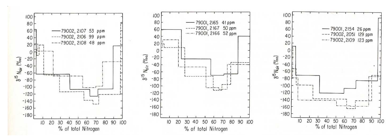 Figure 7: Nitrogen isotopes as function of release temperature for different subsamples of double drive tube 79002/1 (Stone and Clayton 1988).